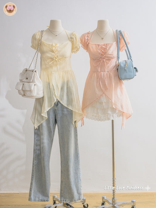 Little Lace Minidress มินิเดรสเเขนตุ๊กตา ตัวยาว ดีเทลมีเชือกผูกคอ ด้านหลังสม็อค