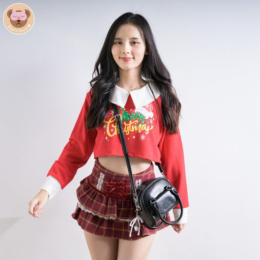 Merry Christmas Crop เสื้อครอปเเขนยาว คอบัว สกรีนลาย ผ้าวูลเวฟ ***ไม่รวมกระโปรง***