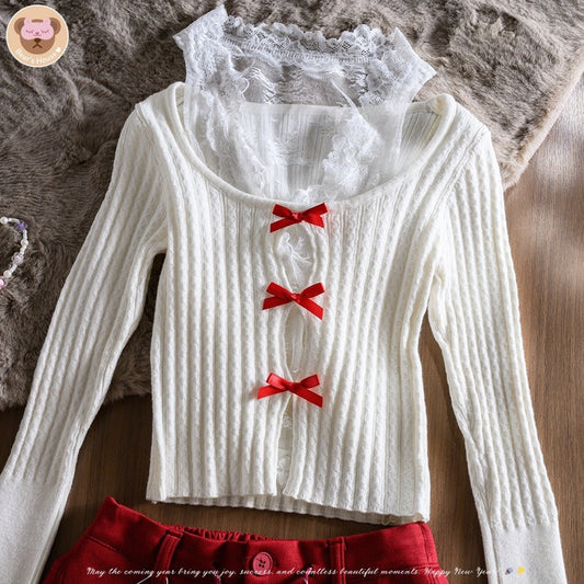 Penny Lace Set เซ็ท 2 ชิ้น เสื้อเเขนกุดลูกไม้ พร้อมกับเสื้อไหมพรมเเขนยาว งานป้าย