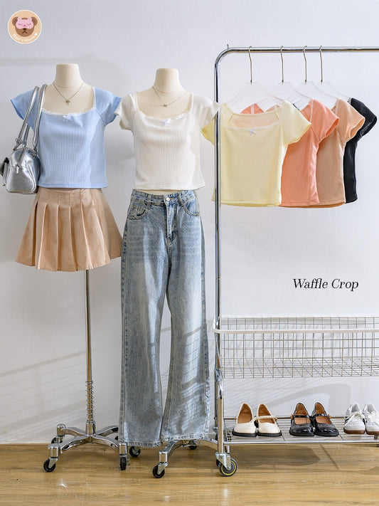 Waffle Crop เสื้อยืดครอปคอเหลี่ยม ดีเทลน่ารักเเต่งขอบลูกไม้ ติดโบว์จิ๋วผ้ามี Texture ในตัว