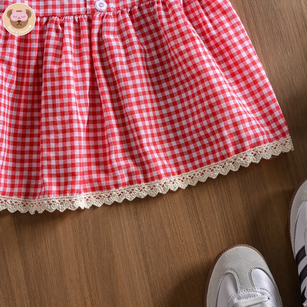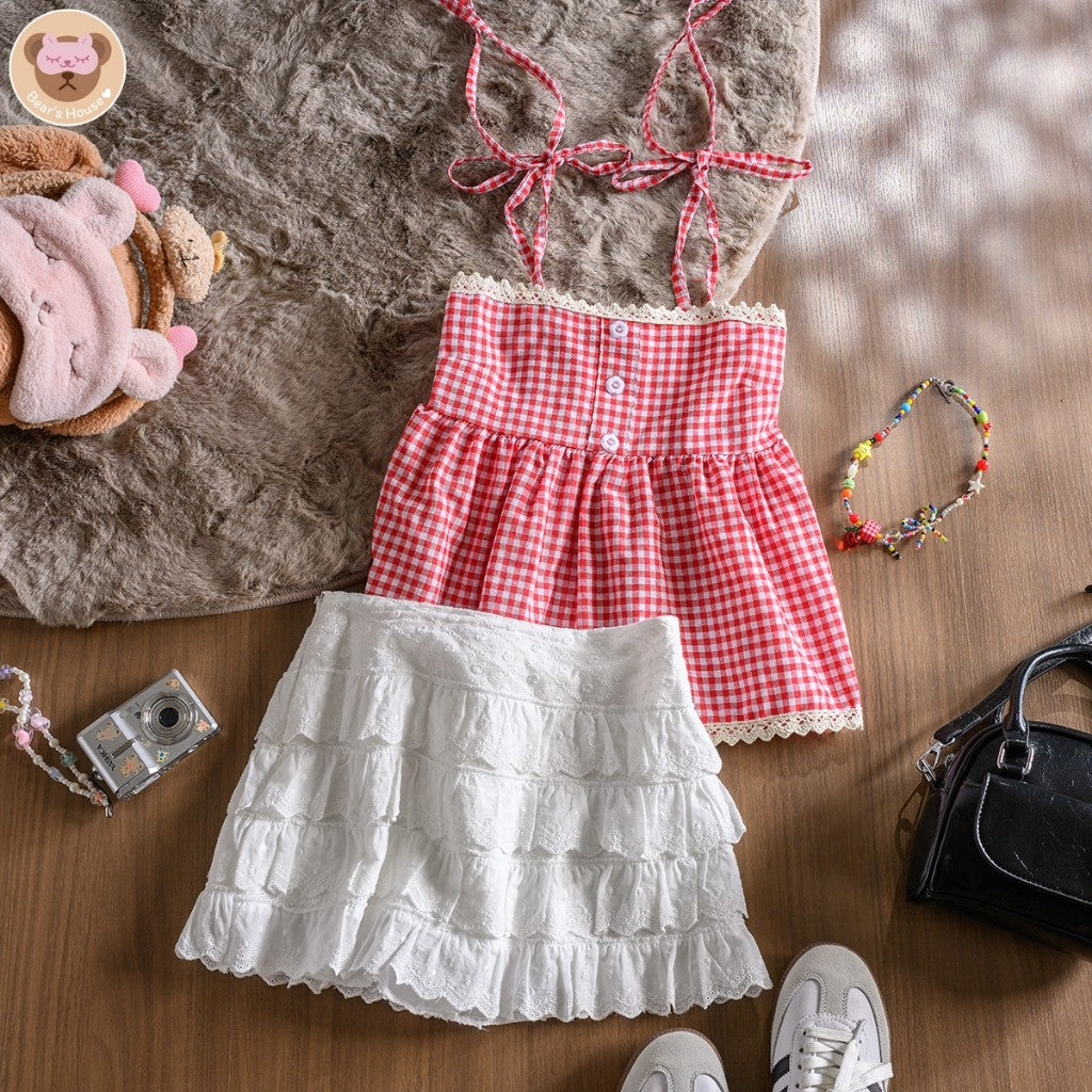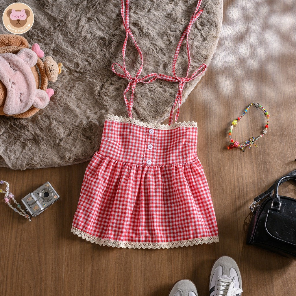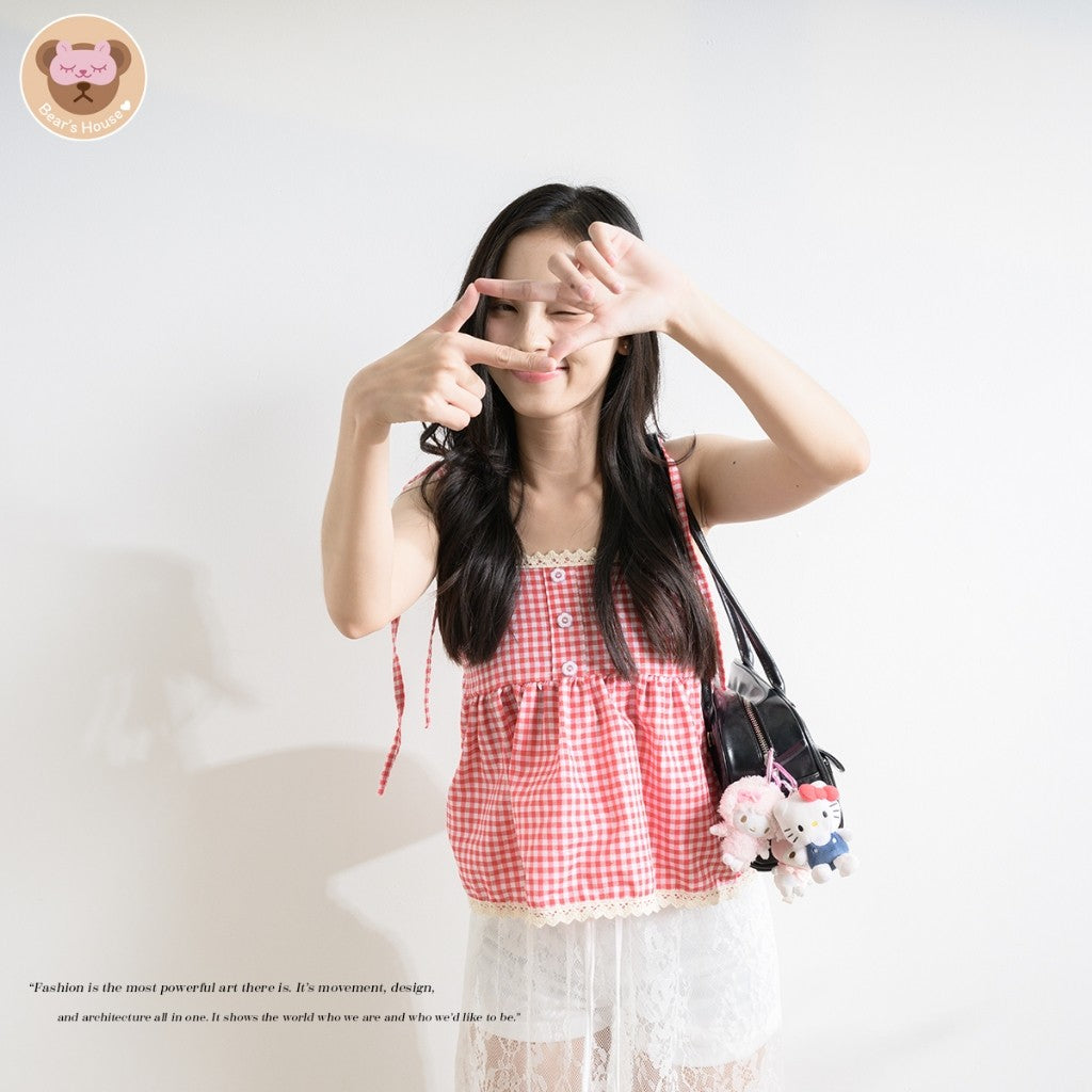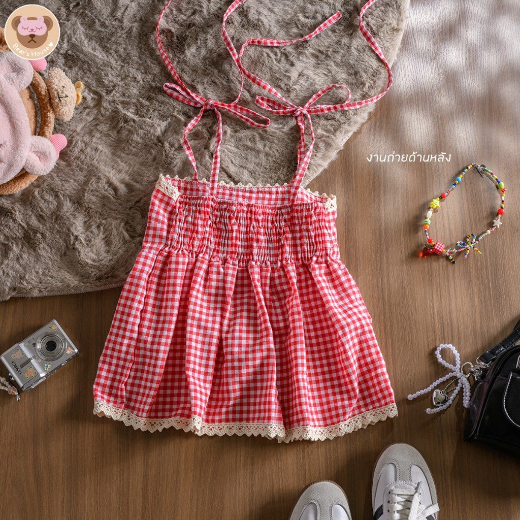 Fay Scotte Crop สายเดี่ยวลายก็อตผูกโบว์ไหล่ เเต่งกระดุมดอกไม้ ช่วงอกเเต่งลูกไม้ ด้านหลังสม็อค น้องน่ารักมาก เเมทกับกระโปรง ถ่ายรูปตีมคริสต์มาสปังเเน่นอน🎄🎅