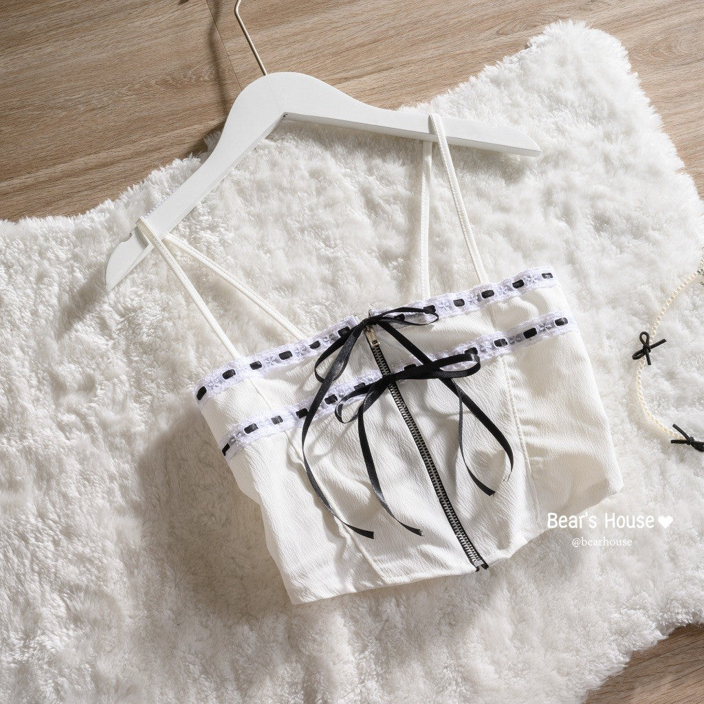 This single-breasted crop top features a trendy black ribbon and a front zipper for added style. The back is smocked for the perfect fit. Pair it with a skirt or long jeans for a killer look.